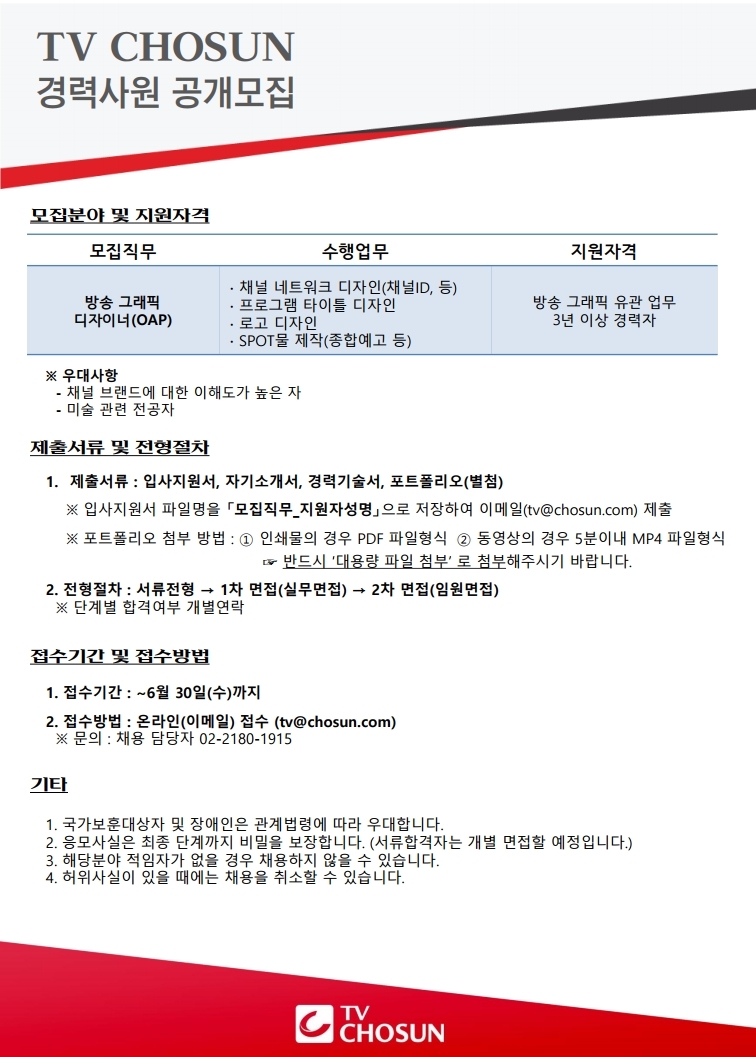 TV CHOSUN 경력사원 공개모집(방송 그래픽 디자이너 OAP)