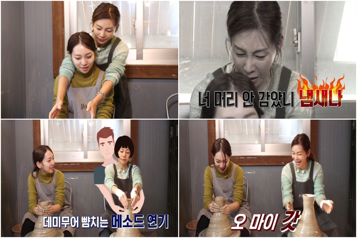 영화를 모른다는 진이에게 “여자가 도자기를 빚고, 남자가 뒤에서~”라고 말하던 황신혜는 급기야 자리에서 벌떡 일어나 딸 진이를 백허그하며 행동으로 설명을 시도한다.