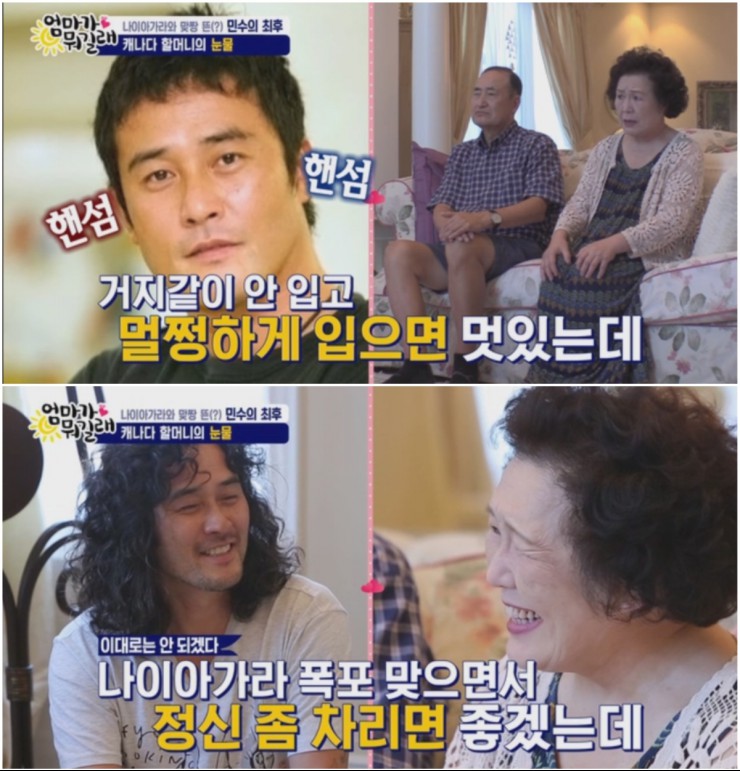 강주은이 최근 최민수의 머리스타일에 대한 불만을 이야기하자 강주은의 친정어머니는 “머리는 멋있는데 옷이 문제다. 멀쩡하게 입으면 우리 민수가 얼마나 멋있는데. 일단 나이아가라 폭포 가서 좀 씻고 와라”라고 말해 최민수를 당황시킨다.