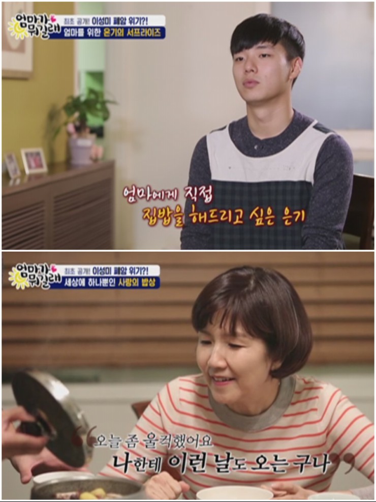 은기는 집으로 돌아오자마자 식사준비를 하려는 이성미에게 “오늘은 내가 밥 할게”라며 솜씨 발휘에 나선다. 은기는 “혼자 외국에 있으면서 아플 때 가장 생각난 것이 집밥이었다. 엄마에게 직접 밥을 해드리고 싶다”고 말한다.