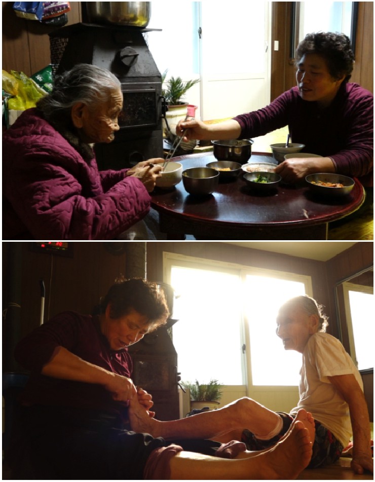 17년 전, 아들이자 남편을 잃은 두 사람은 오랜 시간을 서로 의지하며 살아오고 있다. 며느리는 시어머니를 모시고 자녀를 키우는 등 생계를 도맡아왔다. 때문에 봄에는 꽃을 따고, 가을에는 수확을 하며, 겨울에는 가지치기를 하면서 쉼 없이 움직이다. 덕분에 무릎 관절이 모두 닳아 통증이 심해진 탓에, 밭에 나가면 서서 볼 일을 치를 정도다. 앉았다 일어나기가 힘들어 집안 곳곳에는 의자가 놓여있고, 기다란 막대기는 마치 가제트 팔처럼 물건을 집는데 유용하게 쓰인다.