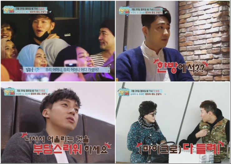 공개된 영상에는 4인 4색 다채로운 모자(母子)의 개성이 고스란히 담겨 보는 재미를 더한다. 자타공인 상남자 김종국은 쿠알라룸프르 공항에서 현지 팬들에게 둘러싸여 엄마와 멀어지자 애타게 “엄마”를 외치며 엄마를 챙기는 자상한 모습을 보이고. 박현빈은 숙소에 도착해 엄마와 한 방을 써야한다는 사실에 폭풍 당황하며 내외하는(?) 모습을 보여 웃음을 자아낸다.