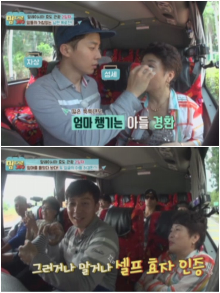 무뚝뚝한 경상도 남자의 전형이자 츤데레의 대명사인 허경환은 유적지로 이동하는 차안에서 땀을 많이 흘린 어머니의 얼굴을 보고 “내가 닦아줄게”라며 손수 땀을 닦아주는 것은 물론, 다리가 아프다는 어머니의 말에 자신의 무릎에 어머니 다리를 올려 마사지를 해줘 주위를 놀라게 한다.