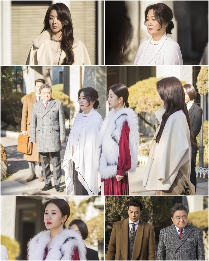 이와 관련 장희진-김해숙-임정은이 따스한 아침 햇살이 내리쬐는 집 마당에서 각기 다른 ‘싸늘한 표정’으로 서 있는 모습이 눈길을 사로잡고 있다. 극 중 한정원, 신현숙, 나영은이 출장길에 오르는 태민호, 태회장(김종구)을 배웅하는 장면. 한정원은 태민호의 비릿한 웃음을 머금은 인사에 어색함을 느끼지만 애써 태연한 척하는 반면, 신현숙은 태회장을 경멸 가득한 시선으로 바라본다. 나영은은 이런 상황에 관심 없다는 듯 가식적인 평온함을 내비치는 것. 거산家 가족들이 무슨 일로 인해 이렇게 스산한 분위기를 풍기는지, 극 중 전개에 관심이 모아지고 있다.