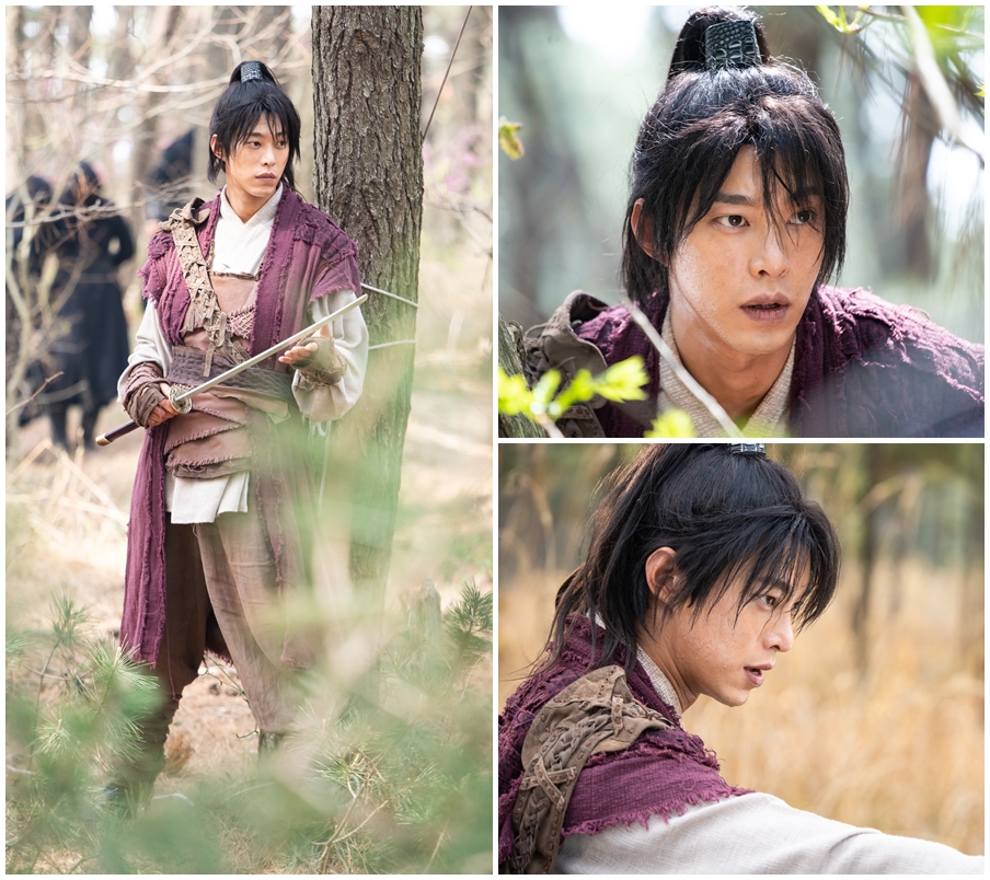 이런 가운데 송원석이 단정한 ‘꽃미모’에 탄탄한 근육이 조화를 이루는, 조선판 ‘베이글남’의 비주얼로 본격적인 촬영에 돌입한 것. 공개된 사진 속 임꺽정(송원석)은 긴 머리를 뒤로 묶은 채 풀숲에서 누군가를 잔뜩 경계하는 한편, 장검을 손에 쥐고 산을 오르며 긴급한 ‘전투 태세’에 돌입하고 있다. 일반적으로 상상하는 우락부락한 산적의 외모와는 달리, 새하얀 피부와 큰 눈망울, 선이 고운 얼굴이 돋보이며 어딘지 모르게 신비로운 분위기를 풍긴다.