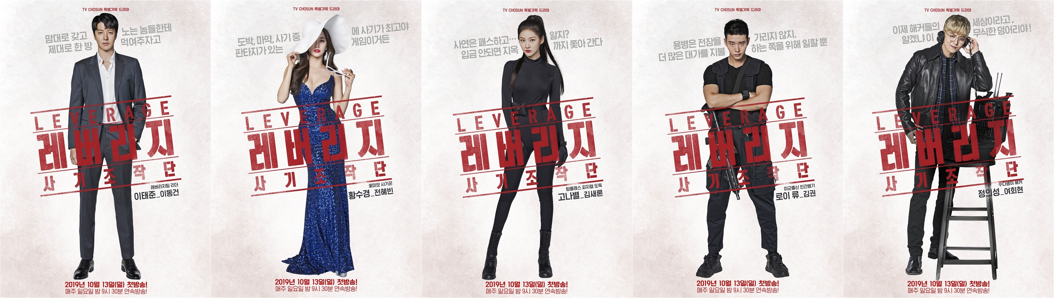 캐릭터 포스터는 마치 긴급 현상 수배 전단지를 연상케 해 흥미를 고조시킨다. 이동건, 전혜빈, 김새론, 김권, 여회현의 전신 위로 ‘레버리지’의