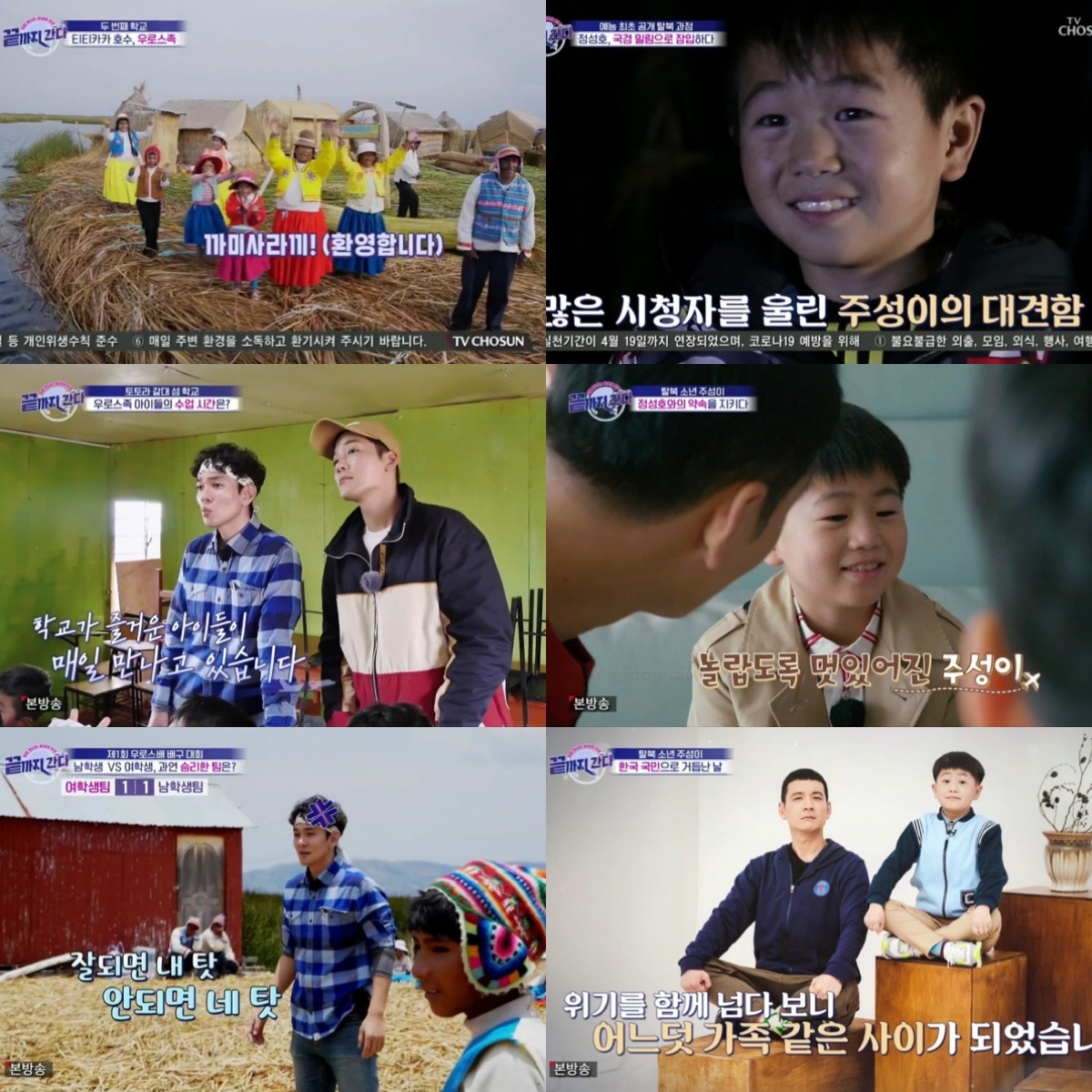 10일 방송된 TV CHOSUN ‘끝까지 간다’의 첫 코너 ‘학교 가는 길’에서는 아마존을 떠나 페루 쿠스코에 도착한 이규한&김진우가 우여곡절 끝에 잉카 제국의 수도였던 마추픽추를 방문했다. 이규한의 버킷리스트였던 ‘위대한 폐허’ 마추픽추는 경이로운 절경을 선사했고, 이곳에서 만난 라마는 이규한과 ‘잃어버린 형’ 수준으로 닮아 있어 모두에게 웃음을 선사했다. 마추픽추를 떠나 페루의 해발 3800m 호수 티티카카에 도착한 이규한&김진우는 ‘토토라’라는 갈대로 만든 초소형 인공 섬을 삶의 터전으로 삼고 있는 우로스족 아이들과 인사를 나누고 등교 준비에 들어갔다.
