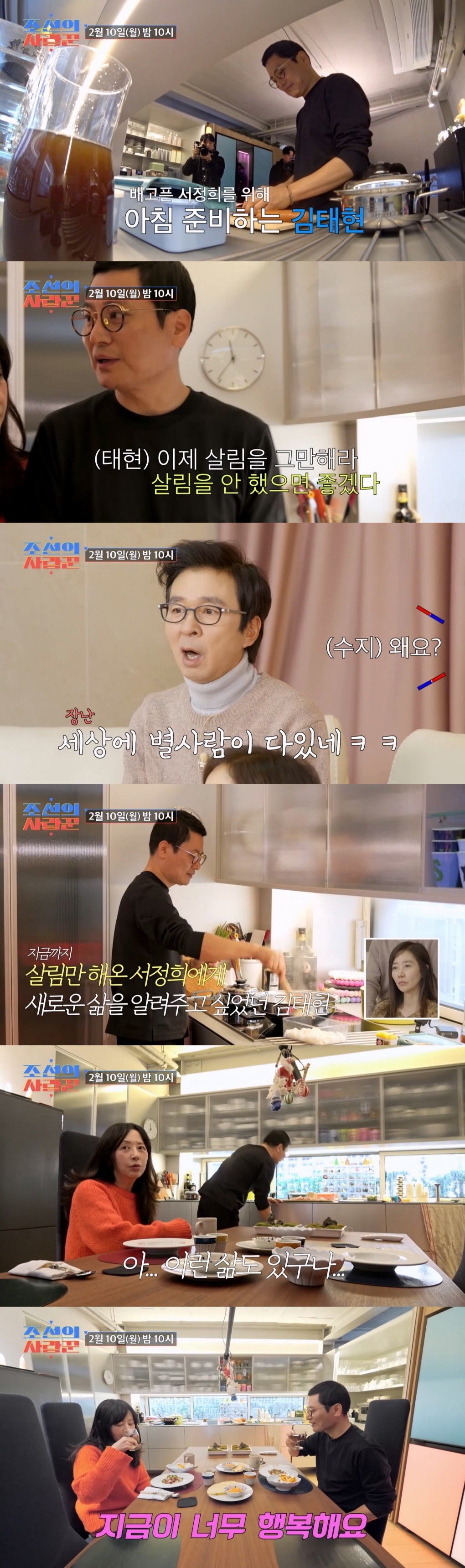 10일 방송될 ‘조선의 사랑꾼’에서는 서정희의 '6살 연하' 남자친구 김태현이 아침을 준비하는 모습이 포착된다. 능숙한 솜씨로 서정희를 위해 요리를 준비하던 그는 "서정희 씨가 평생 너무 많은 살림을 한 것 같다. 저랑 있을 때만큼은 이제 살림을 안 했으면 좋겠다"고 애정을 드러냈다. 이에 김국진은 "세상에 별 사람이 다 있다"며 견제(?)를 시작했다. 그러자 강수지는 "왜요? 언니한테는 저런 분이 지금 필요하다"며 곧바로 김태현을 옹호해 웃음을 자아냈다.