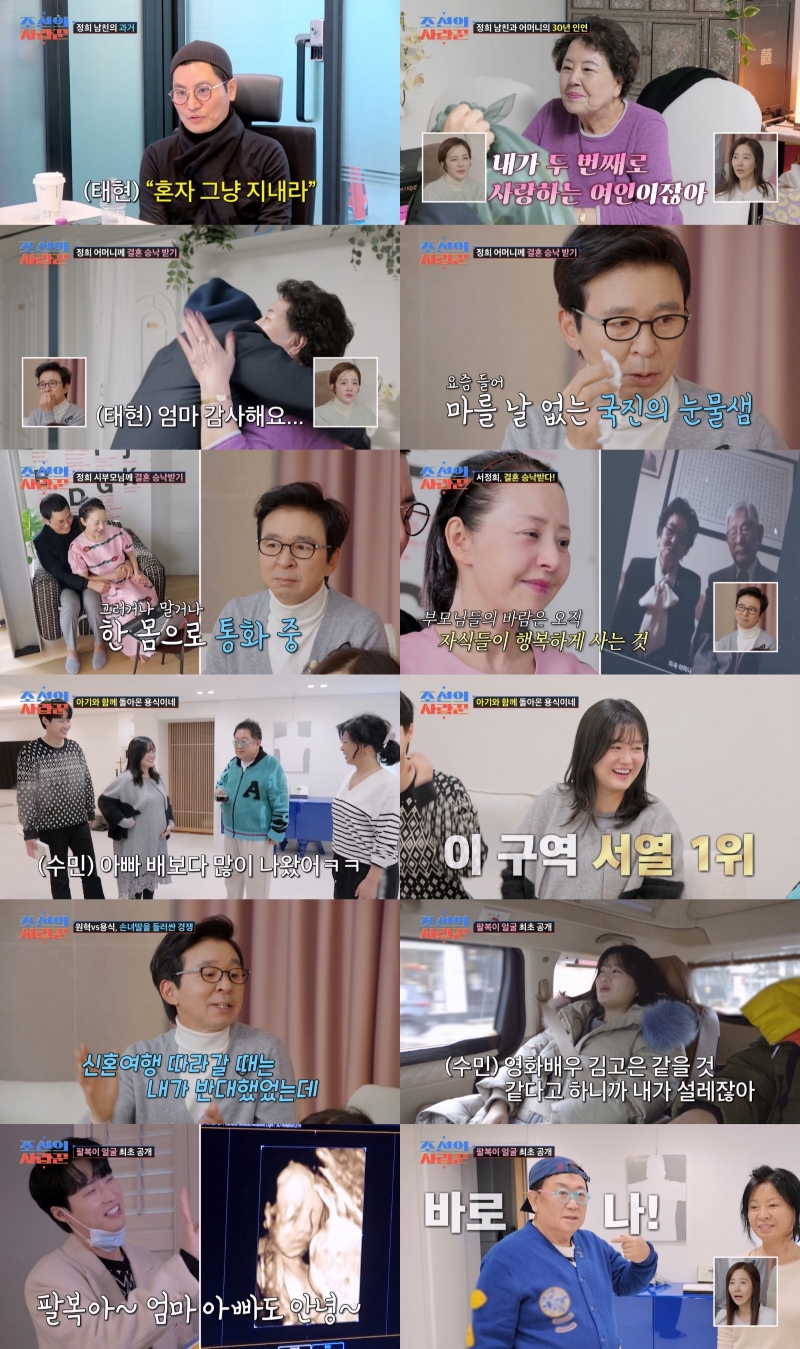 한편, '울보 비밀 남친(?)'에서 당당히 '팔복이 아빠'로 거듭난 원혁이 임신 7개월 차가 된 '♥이수민'과 함께 처가살이 일상을 공개했다. "5월 5일 어린이날 무렵이 출산 예정일"이라는 이수민은 팔복이의 성별을 공개하며 "첫째 딸은 아빠 닮는다는 말이 있다. 양가가 걱정이 많다"며 농담을 건넸다. 거기다 이용식은 팔복이의 첫 초음파 날 심장 소리를 듣고 오열해 병원에서 '울보 할아버지'로 통한다는 근황을 공개해 폭소를 유발했다. 이에 황보라는 "이러다 산후조리원도 (이용식과) 같이 들어가시는 것 아니냐"고 예상해 웃음을 자아냈다.