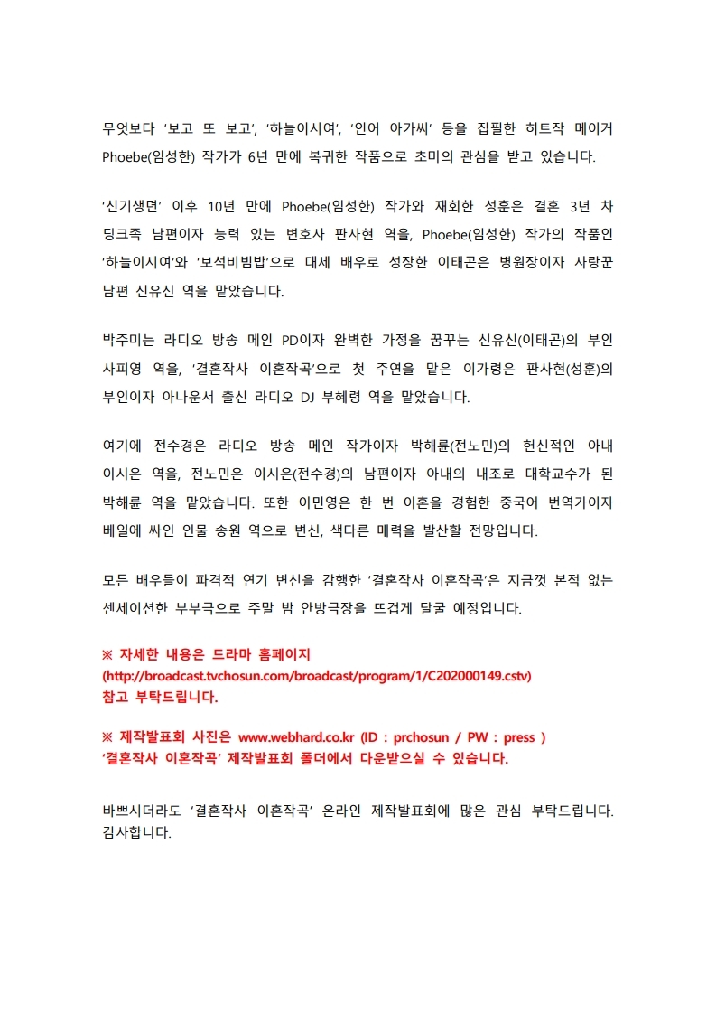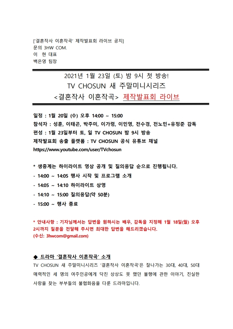 프레스룸 핫이슈 프로그램 오늘의 프로그램 프로그램 사진 자료 공지사항 [공지] 주말미니시리즈 <결혼작사 이혼작곡> 온라인 제작발표회 2021.01.14 이전 [공지] 토일드라마 <복수해라> 온라인 제작발표회 2020.11.20 다음 [공지] <미스트롯2> TOP7 종영 인터뷰 및 <내 딸 하자> 온라인 제작발표회 2021.03.25 목록