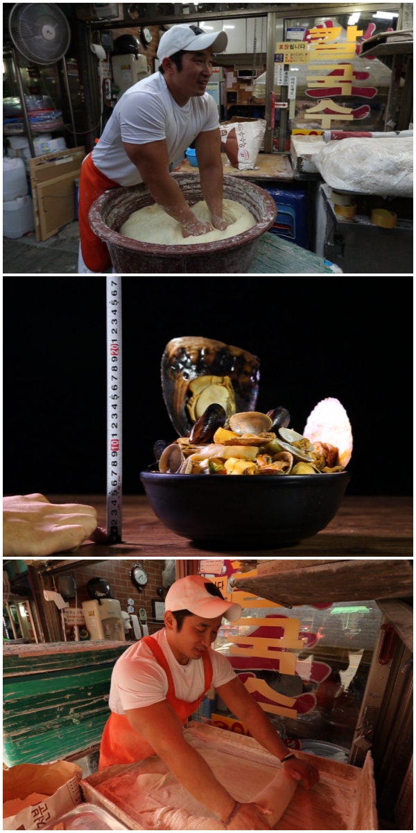 또 정경수 헌터는 “탱글탱글한 면발의 비밀은 바로 떡메”라며 주걱에 반죽을 돌돌 말아 사정없이 내리친다. 정경수 헌터는 “반죽 안의 공기층이 주걱으로 내리침과 동시에 사라져 면발이 훨씬 차지고 먹기 좋은 식감을 자랑한다”고 말한다.