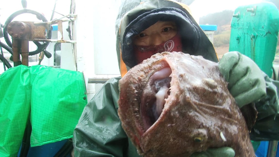 하지만 쏟아지는 비에 파도까지 높게 일어 촬영조차 쉽지 않은 상황. 한참의 노력 끝에 모습을 드러낸 바다의 푸아그라인 바다 최상위 포식자, 아귀다.