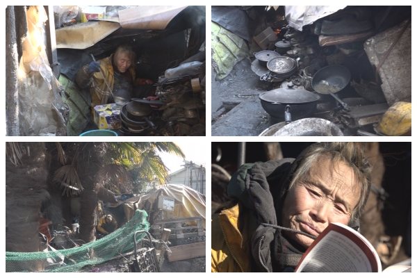 이런 행동도 걱정스럽지만 그녀의 행색 또한 초라하기 이를 데 없었다. 색을 알아볼 수 없을 정도로 때가 꼈고, 낡아서 구멍이 숭숭 뚫려 한겨울 추위를 막아내기엔 역부족인 옷들. 그런 남루한 행색으로 하루 내내 쓰레기통을 뒤지더니, 남루한 움막으로 들어갔다. 도로가에 자리한 움막은 사람이 산다고 하기엔 처참 그 자체였다. 움막 주변엔 쓰레기를 방불케하는 잡동사니가 끝도 없이 쌓여있고, 널브러진 통들엔 썩은 생선 오물들로 악취를 풍기고 있었다. 게다가, 전기와 수도는커녕 난방장치나 조리기구 하나 없이 구덩이에 불을 피워서 생활하는 여자. 어쩌다 불씨라도 튀는 날엔 큰 화재로 번질 위험이 커보였다. 더욱 놀라운 건, 생선 쓰레기를 끓인 물을 넣은 컵라면으로 끼니를 때운다는 여자. 먹고 자고 입는 인간의 기본생활 자체가 불가능한 생활. 대체 왜 이런 열악한 생활을 하고 있는 걸까?