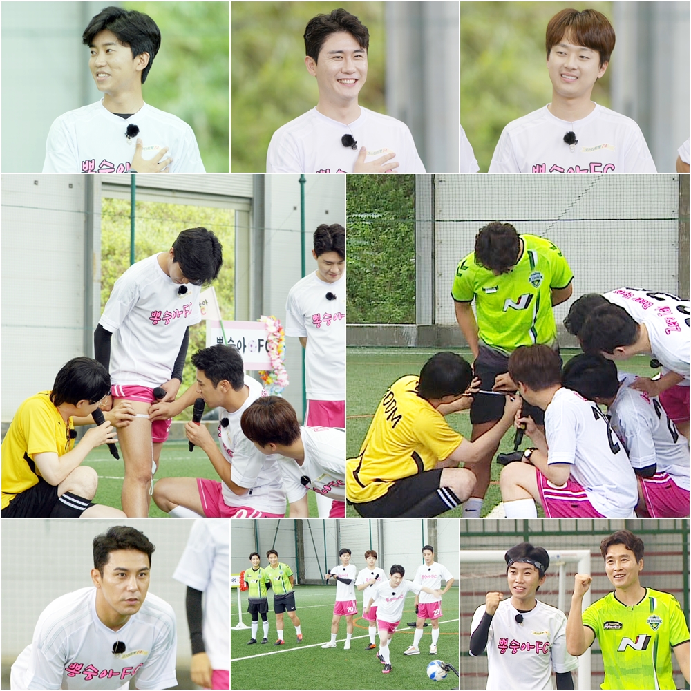 특히 '트롯계 메시'로 불리는 임영웅과 청소년 국대 출신의 실력자 신유의 만남에 이목이 집중됐다. 트롯계의 축구 1인자를 가려낼 역사적인 날. 신유까지 합세한 대박 FC와 뽕숭아 FC는 신체 검사의 일환으로 허벅지 둘레 재기에 돌입했다. 임영웅은 뽕숭아 대표 허벅지의 자존심을 지키기 위해 양쪽 허벅지를 드러내며 승부욕을 불태웠다. 이어서 트롯맨들은 킥 파워 대결, 발리슛 대결을 이어 갔다. 발리 장인으로 불리는 이동국에게 “프로 선수급 실력을 가지고 있다”는 특급 칭찬을 받은 1인자가 있는데, 누구인지 방송에서 공개된다.