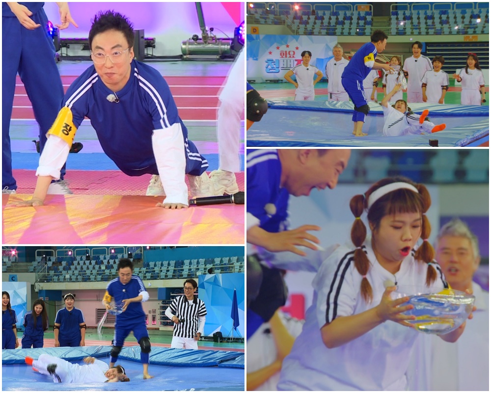 특히 박명수는 상대팀 팀장 홍현희와 ‘티키타카 남매 케미’를 뽐내며 시선을 강탈할 예정이다. 두 사람은 매번 새로운 게임에 돌입할 때마다 몸을 내던지는 시범 게임으로 큰 웃음을 빵빵 터트렸던 터. ‘믿고 보는 케미’를 입증하듯, 박명수와 홍현희는 청백전 팀장으로서 주고받는 날 선 신경전뿐만 아니라 거침없는 물폭탄 공격을 가하고, 7세 아이를 방불케 하는 몸싸움을 펼치는 등 ‘환상의 콤비 플레이’로 체육관을 폭소로 뒤흔든다.