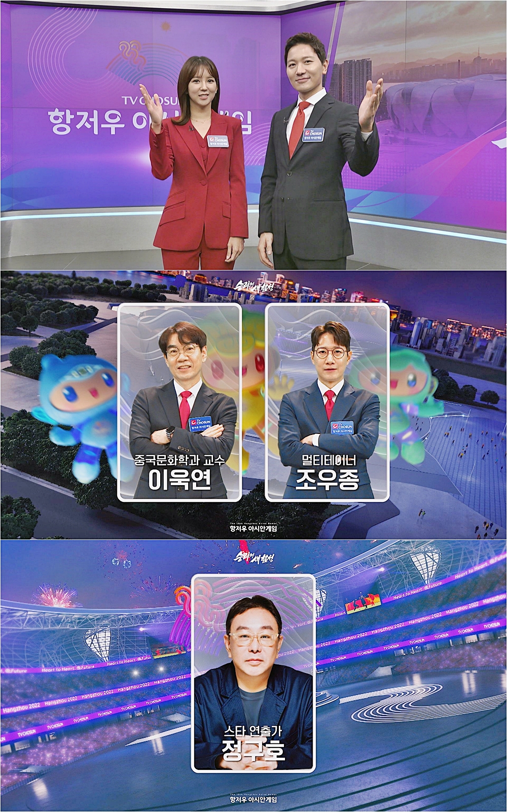 개회식 중계는 먼저 김정근 캐스터와 오현주 앵커가 진행하는 프리뷰쇼로 막을 연다. 프리뷰쇼에서는 아름다운 서호를 품은 도시 항저우를 소개한다. 항저우는 신석기 농업문명의 중심지이자 남송 시대의 수도였고 현대에 들어서는 IT 등 첨단산업의 중심지로 성장하고 있다. 서호의 연꽃을 형상화한 주요 경기장과 마스코트 로봇 삼총사도 프리뷰쇼에서 미리 만나볼 수 있다. 또 박태환 이후 3관왕을 노리는 수영의 황선우와 만리장성을 넘어 금메달을 따겠다는 탁구 신유빈 등 우리 선수단의 당찬 포부도 들을 수 있다.