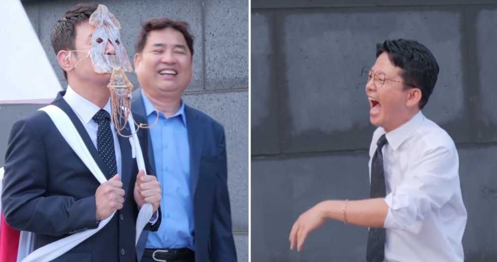 이어 함잡이들은 "일단 파란색은 없다"며 함값 봉투를 들어 올렸고, 두둑한 함값에 '함진아비' 김대희는 공중 발박수로 화답해 웃음을 자아냈다. 그러나 김대희는 곧바로 멈춰섰고, 스튜디오에서 이를 보고 있던 강수지는 "오징어 가면이 얼굴에 작다. 귀가 빨개졌다"며 안쓰러워해 웃음을 자아냈다.
