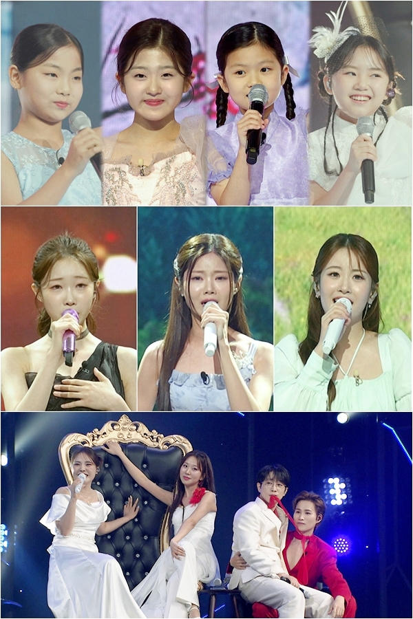 ‘차세대 트롯 퀸' 윤윤서, 김예은, 송나윤, 최이정이 ‘미스&미스터’들을 바짝 긴장시키는 무대로 현장을 뒤집어놓는다. 특히 한글보다 판소리를 먼저 뗀 ’국악 신동' 최이정이 만 8세 답지 않은 구슬픈 구음으로 박정식의 ’천년바위'를 완벽히 소화해 낸다. 이에 질세라 각종 가요계를 휩쓴 윤윤서가 고음과 꺾기를 살린 가창력과 애교 넘치는 안무로 나훈아의 ’고장난 벽시계'를 사랑스럽게 재해석해 미소를 유발한다.
